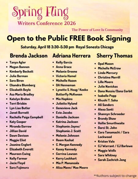 The booksigning event is open to the public on Saturday, April 18 from 3:30-5:30pm CDT at the Royal Sonesta Hotel in Chicago and will feature so many romance authors! Like these: